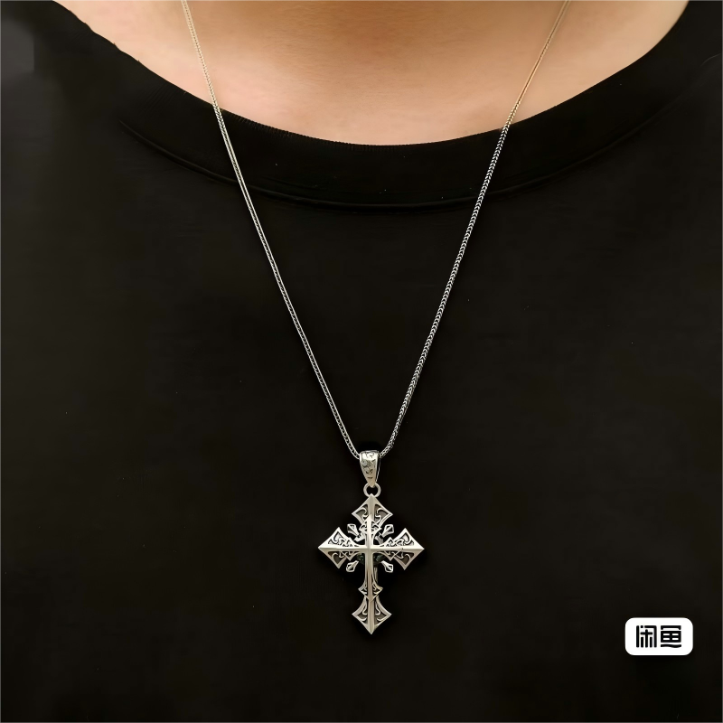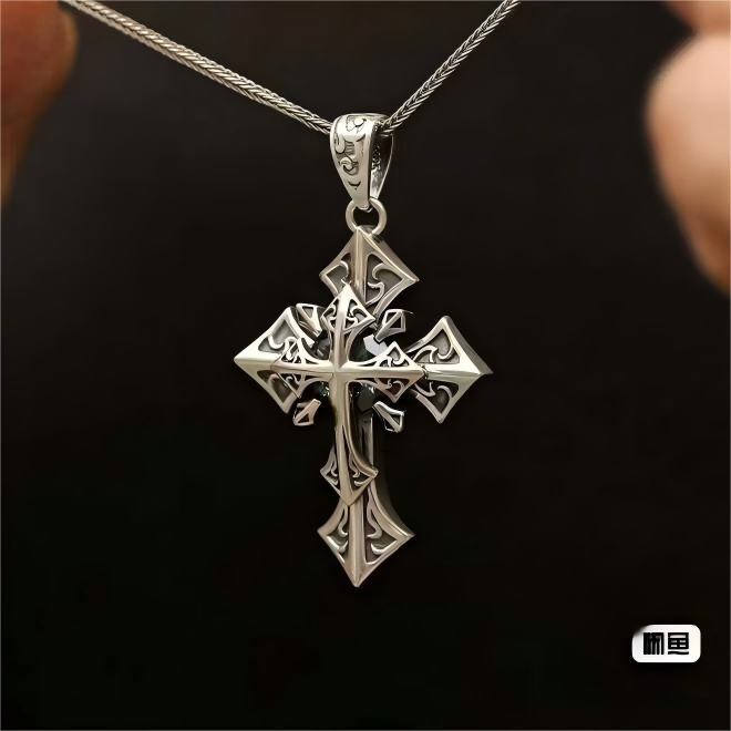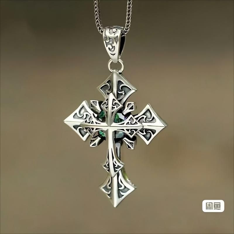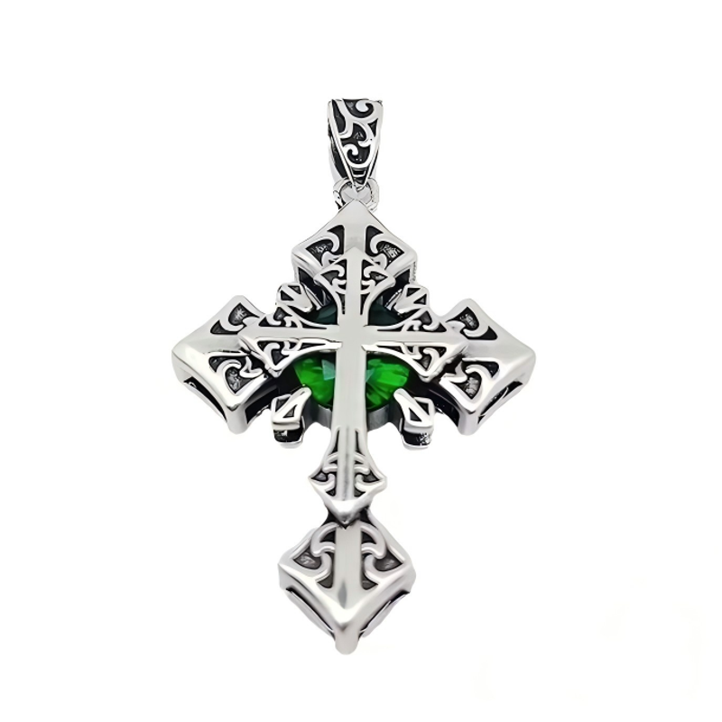 Vintage Silver Cross Necklace with Green Gemstone Inlay