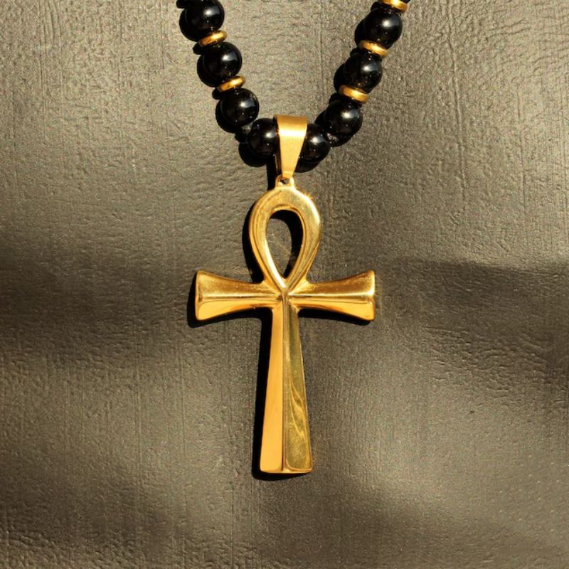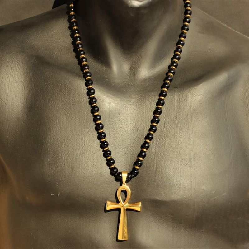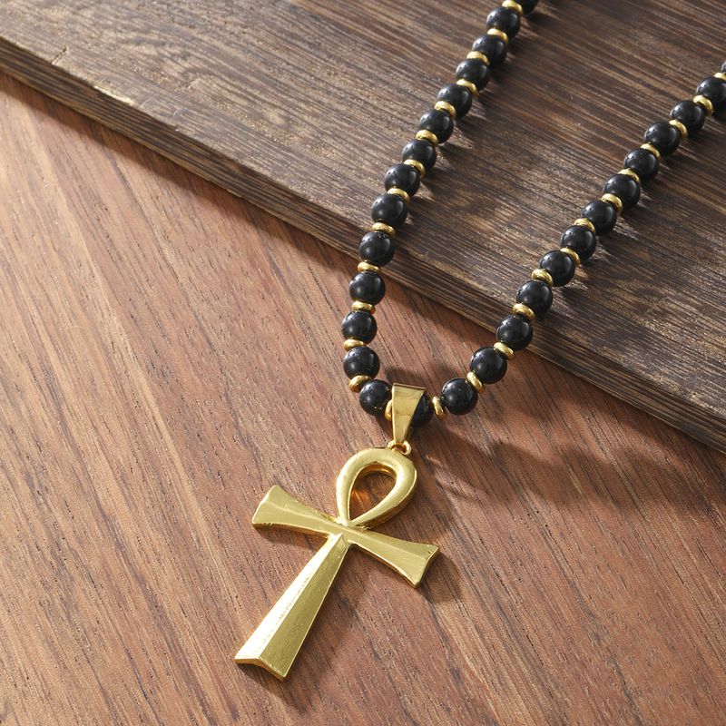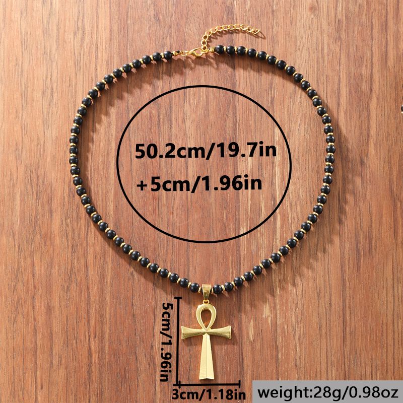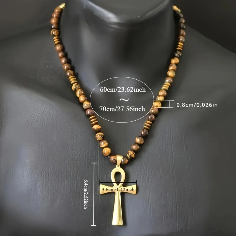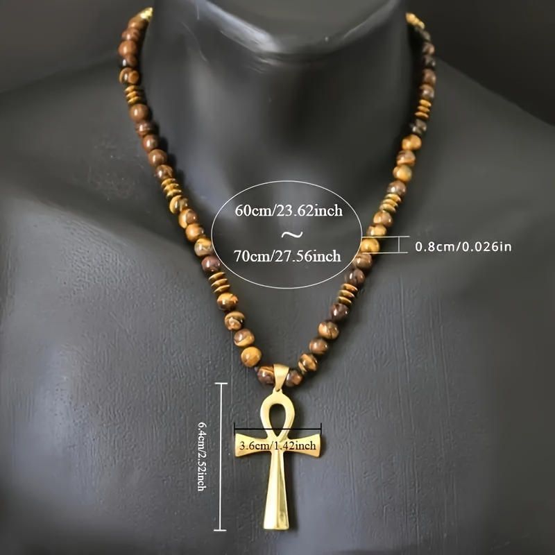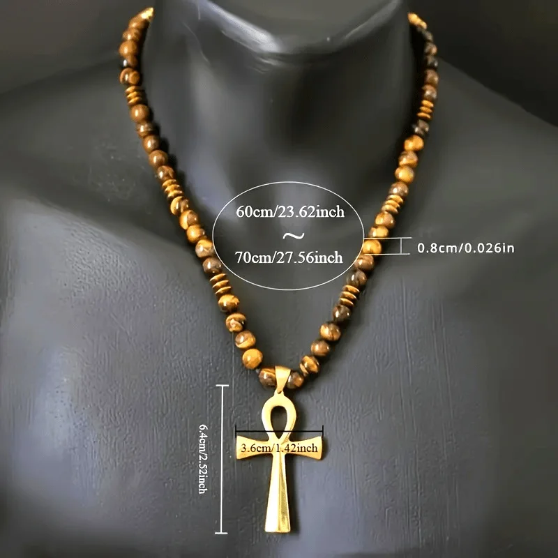 Religious Christian Natural Stone Tiger Eye Stone Bead Gold Hematite Cross Necklace