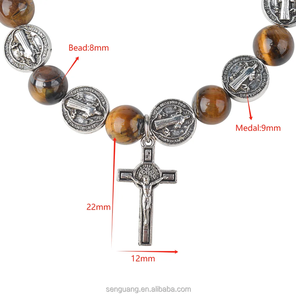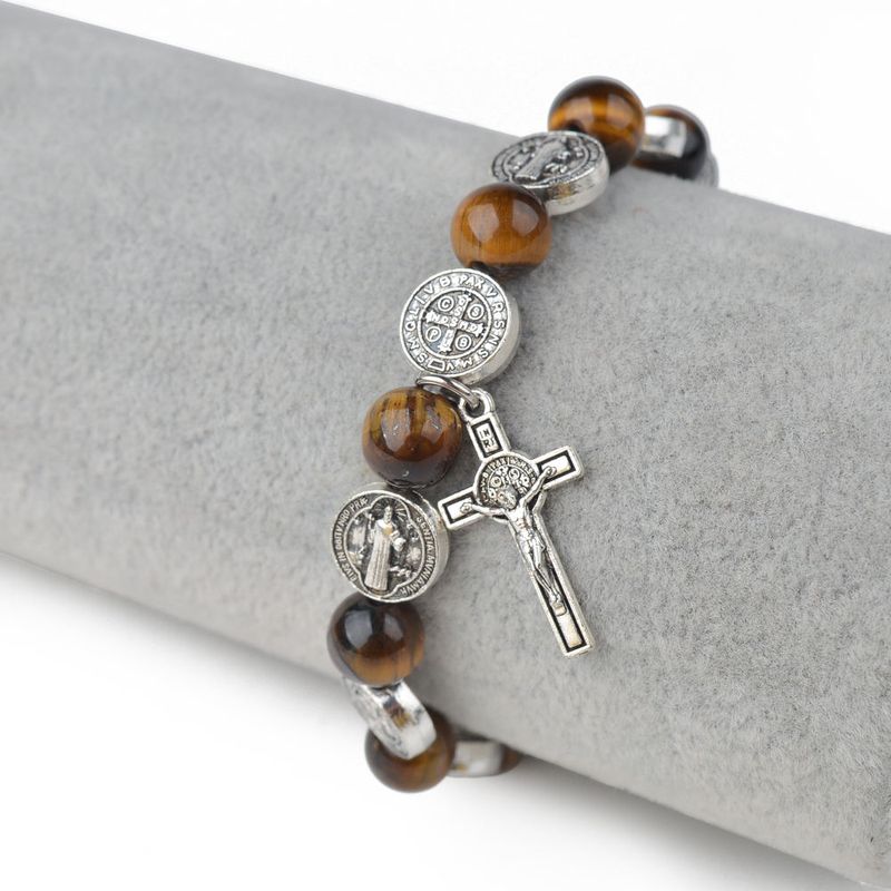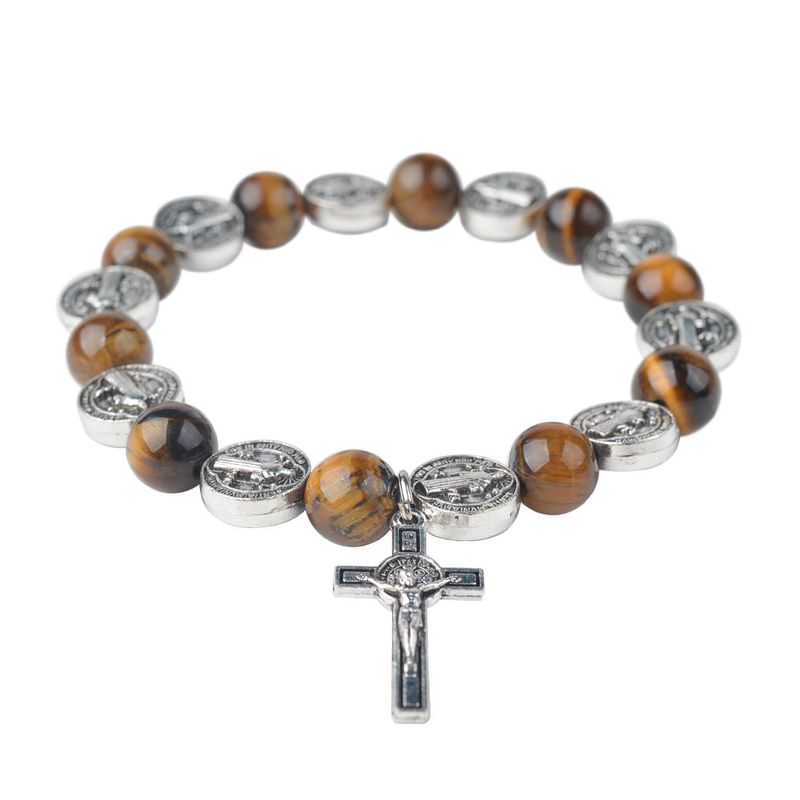 Tiger's Eye Beaded Bracelet Elastic St. Benedict Rosary Catholic Cross Pendant